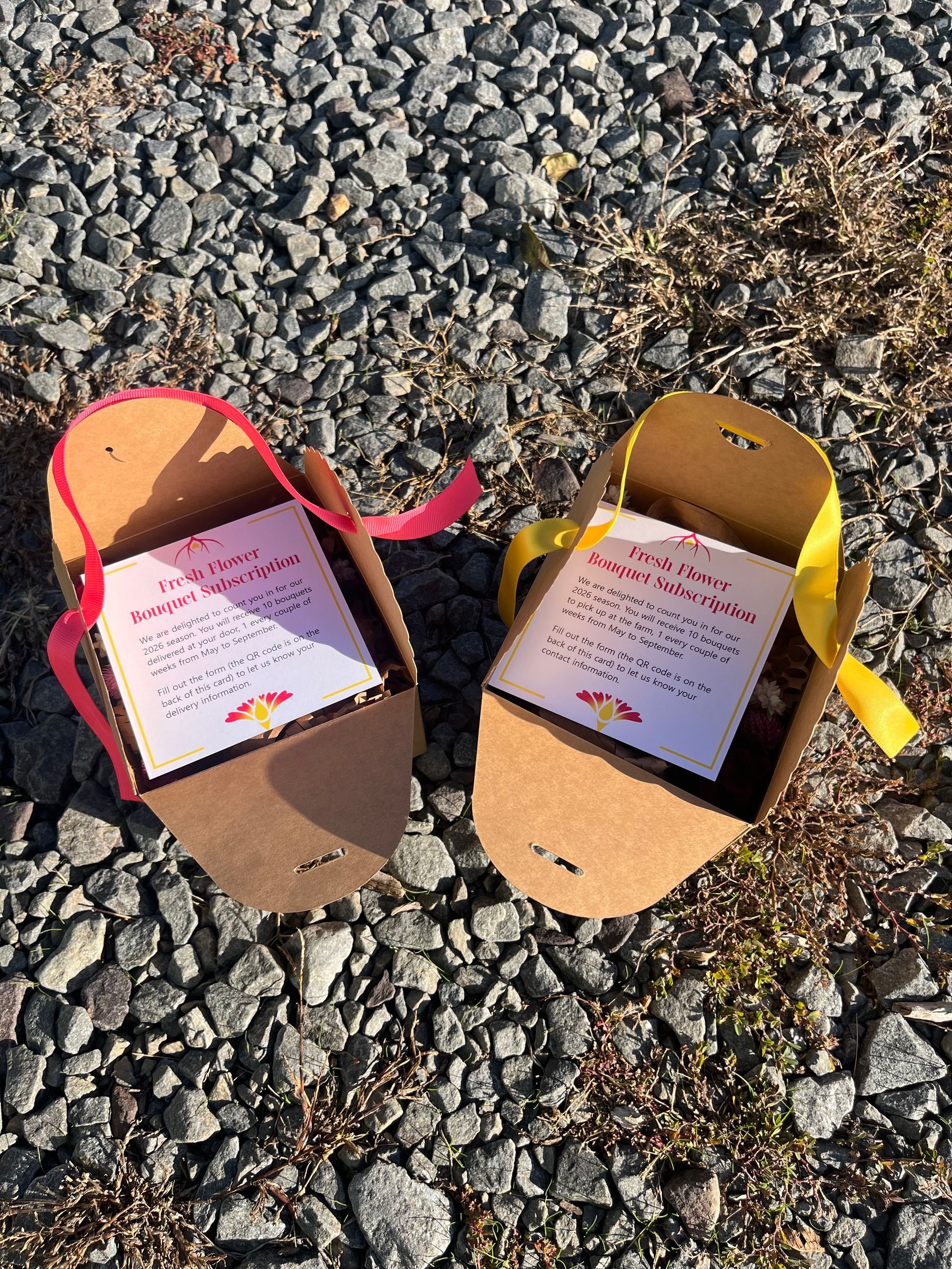 Support our little farm during the off-season with one of our subscriptions available to purchase from November to April. A Fresh Flower subscription includes 10 bouquets from May to September (1 bouquet every 2 weeks) AND a cute gift box with one of our dried flower jar announcing the subscription. Perfect gift for someone you love or for yourself.