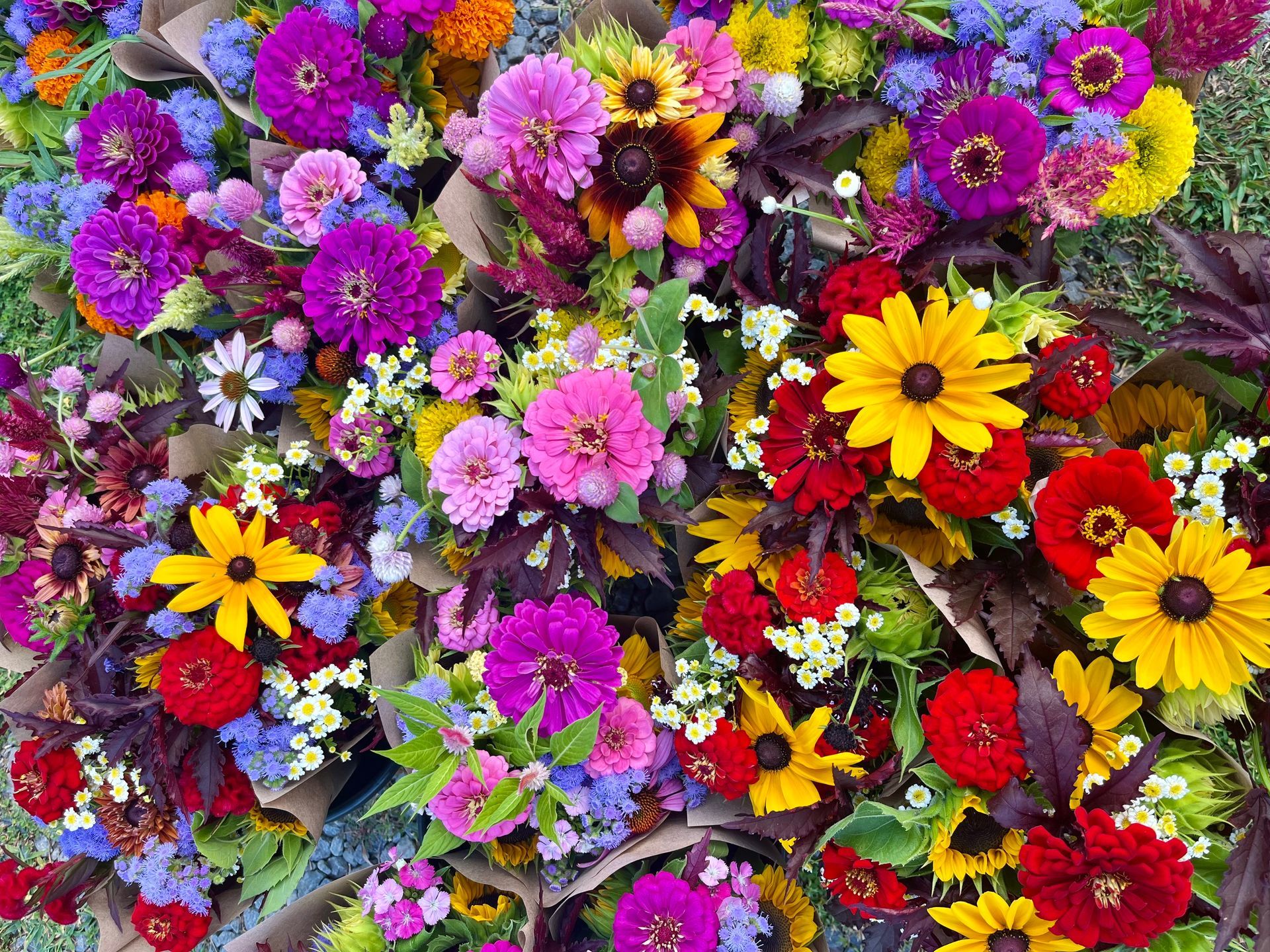 Seasonal blooms freshly cut from our farm and arranged in a bouquet. (Spring to Summer : yarrow, sunflowers, zinnia, ageratum, echinacea, marigold, celosia, gomphrena, ...)